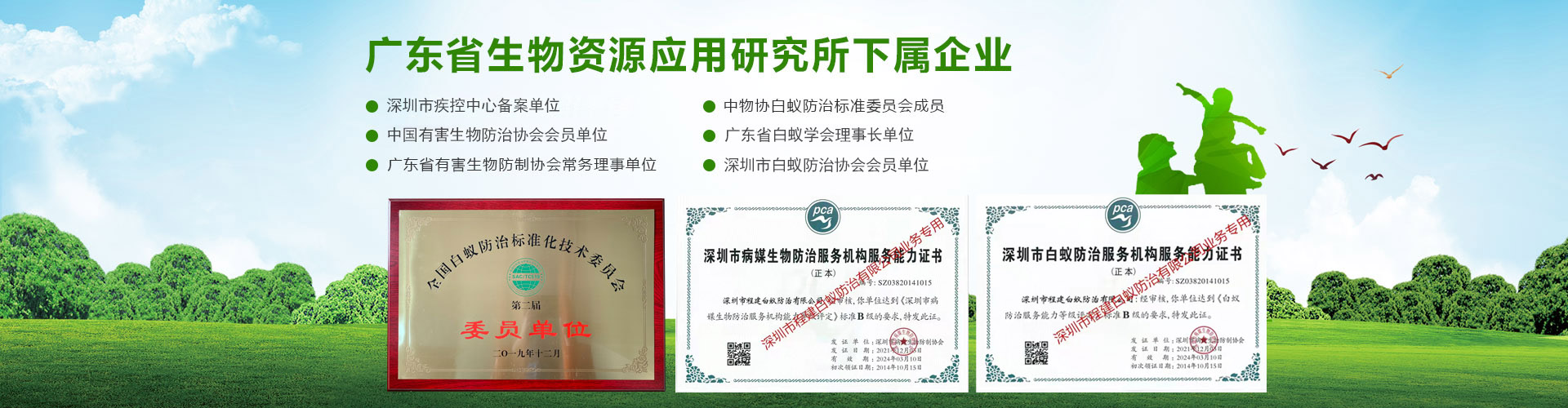 專注于徹底根治、防治結(jié)合,售后跟蹤服務(wù),專業(yè)服務(wù)工程師有豐富實戰(zhàn)經(jīng)驗超過十年。持有專業(yè)資格證書認(rèn)證:“有害生物防制服務(wù)機構(gòu)服務(wù)能力證書B級”、“白蟻防治服務(wù)機構(gòu)服務(wù)能力證書B級”所有員工持有“深圳市白蟻防治上崗證”和“深圳市除蟲滅鼠上崗證”,雙資格證上崗服務(wù)。榮獲過:“優(yōu)質(zhì)服務(wù)示范單位”、“白蟻防治服務(wù)信譽AAA級單位”、“深圳市白蟻防治先進(jìn)單位”、“深圳市十大白蟻防治品牌”、“深圳市殺蟲公司”、“深圳市消殺公司”先進(jìn)單位等榮譽。